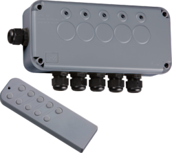 Weatherproof 13A remote controlled 5-way switching unit, manufactured from robust, impact resistant polycarbonate.