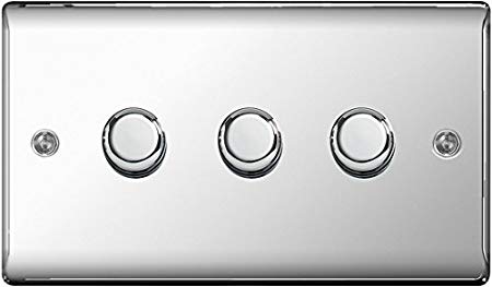 The BG Electrical Nexus Metal NPC83 is a polished chrome triple (3 gang) two-way dimmer light switch, rated at 200W and manufactured by British General Electrical.