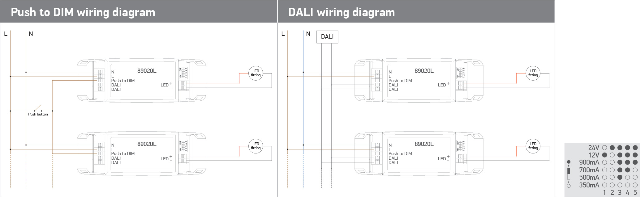DALI & Push to DIM LED driver Adjustable output using DIP switches.